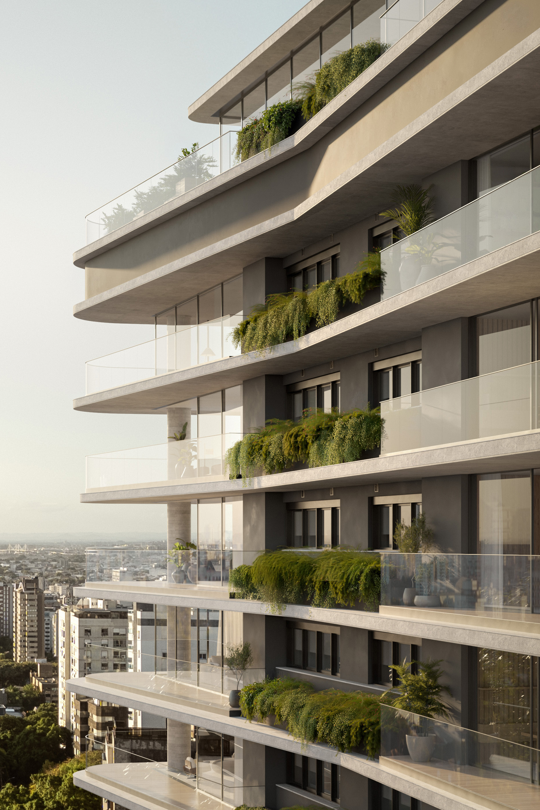 A sinuosidade do concreto e do guarda-corpo em vidro confere dinamismo e movimento à elegância da arquitetura que busca honrar o afeto que o estilo de vida uruguaio provoca em quem conhece o país. Associado às esquadrias piso-teto, o guarda-corpo curvo contribui para a sensação de leveza e de transparência pretendida pelo arquiteto José de Barros Lima, autor do projeto arquitetônico do Brava.