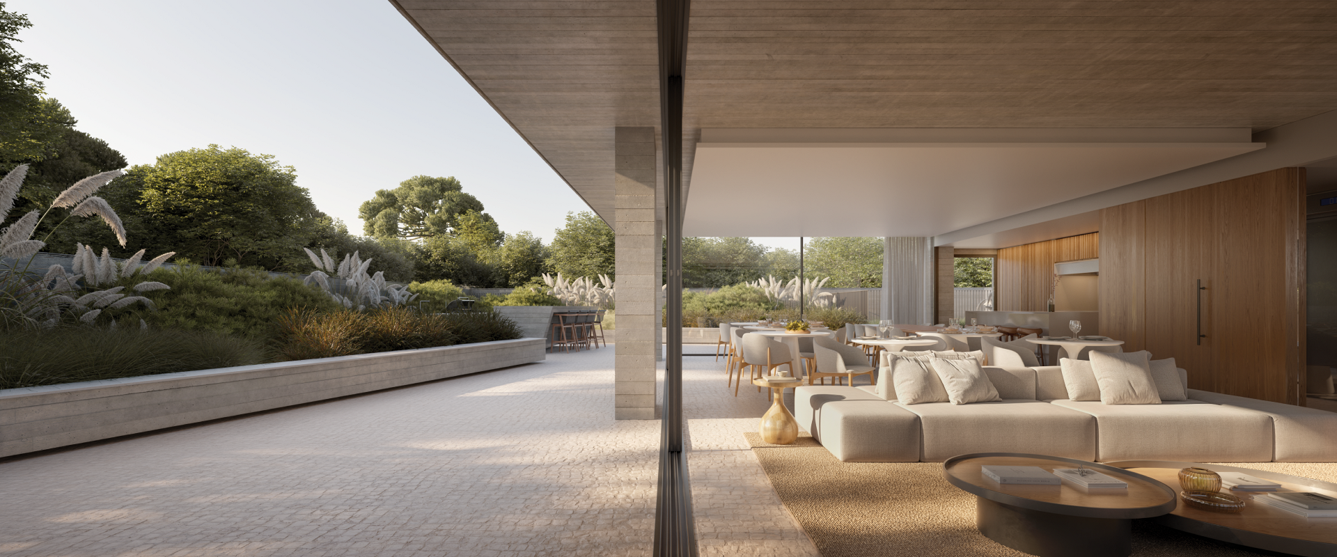 No segundo pavimento do Mansa revela-se uma verdadeira praça elevada, onde arquitetura e paisagismo se encontram em equilíbrio. Os fechamentos em vidro delimitam os ambientes condominiais sem isolá-los, preservando a continuidade visual e permitindo que o verde permaneça sempre presente. O Salão Gourmet se abre para o exterior, ampliando a experiência para além das paredes. A churrasqueira externa, o firepit e o playground foram concebidos para diferentes momentos do dia, em um cenário onde convívio, ar livre e natureza coexistem com naturalidade.
