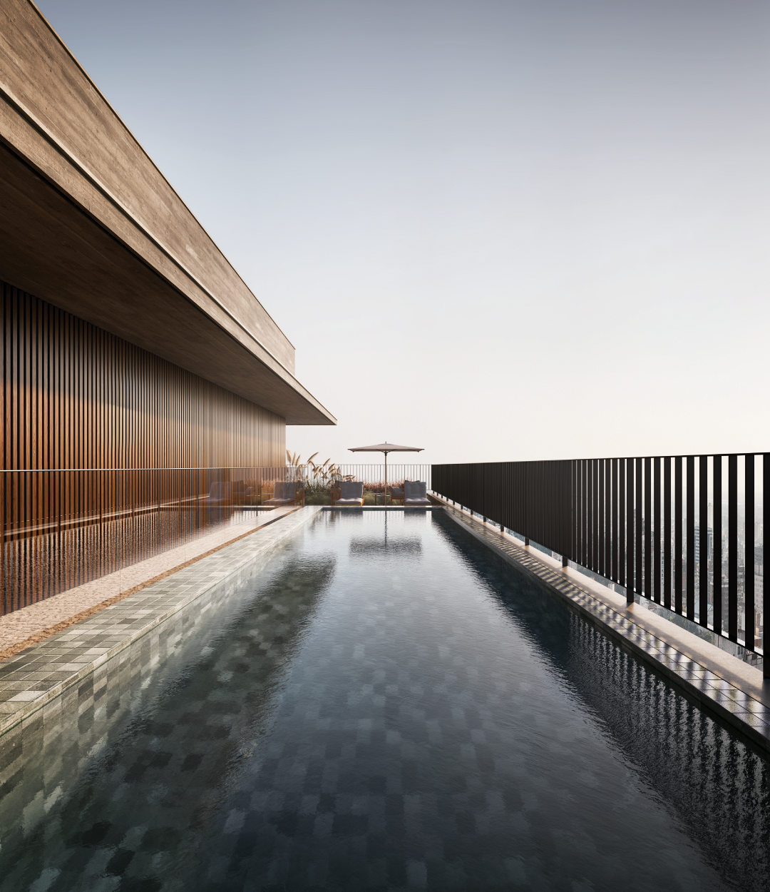 No ponto mais alto do Mansa, a piscina foi concebida para aproveitar a orientação norte e a excelente insolação ao longo do dia. A previsão para aquecimento amplia seu uso nas diferentes estações, mas é no verão que ela revela plenamente sua vocação solar. Elevada acima da paisagem urbana, a área convida à contemplação. A vista aberta e o céu amplo ampliam a sensação de respiro e de pausa.