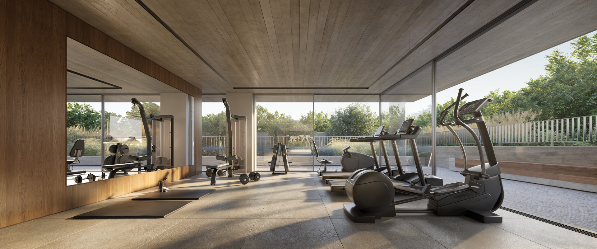 A academia integra essa experiência de forma orgânica, complementando os espaços de convivência com um ambiente dedicado ao cuidado com o corpo. Inserida na mesma linguagem arquitetônica do empreendimento, mantém a relação com a luz e com o conjunto das áreas comuns, reforçando a ideia de equilíbrio entre atividade e serenidade. No Mansa,o bem-estar é integrado à rotina, distribuído pelos espaços e sustentado pela forma como o projeto privilegia ar, luz e permanência.